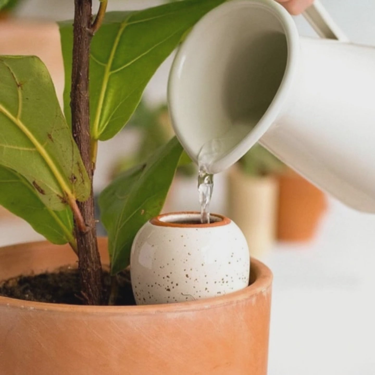 Qu'est ce qui se cache sous ces jolies feuilles ? Un réservoir d'eau en terre cuite aussi appelé olla. Sa particularité ? Il diffuse l'eau progressivement en fonction des besoins de la plante. Il suffit de le planter et de le remplir d'eau dés qu'il est vide, il s'occupe de l'arrosage tout seul ! Vous pourrez enfin faire croire à vos proches que vous avez la main verte !